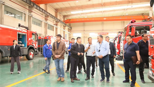 在北京中卓時代消防設備科技有限公司,代表團實地考察了遠程供水系統、舉高類消防車、機場主力消防車、重型泡沫車、宿營車等消防車輛裝備。