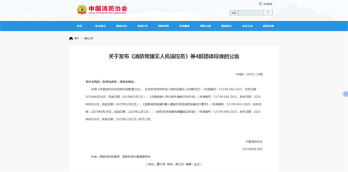 2025年8月26日,中國消防協(xié)會批準(zhǔn)發(fā)布《消防救援無人機(jī)操控員》(T/CFPA 043—2025)團(tuán)體標(biāo)準(zhǔn)。該標(biāo)準(zhǔn)是我國消防救援無人機(jī)領(lǐng)域的首部職業(yè)技能規(guī)范,構(gòu)建了初、中、高三級職業(yè)能力體系,明確了七大應(yīng)用場景的技術(shù)要求,將顯著提升復(fù)雜災(zāi)害現(xiàn)場的救援能力。