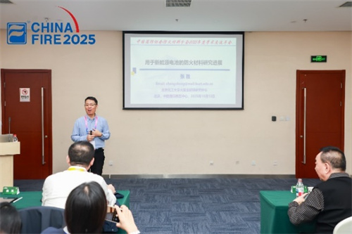 北京化工大學張勝教授做了題為《用于新能源電池的防火材料研究進展》的特邀報告,報告聚焦阻燃多功能微球在鋰電池隔膜中的應用、阻燃多功能微球在凝膠電解質中的關鍵作用、電池熱管理的相變材料及阻燃隔熱電池外殼,系統展示了其在新能源電池防火領域取得的系列創新成果,為新能源電池用防火材料研究提供了新的技術路徑與發展方向。