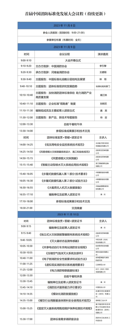 由中國消防協會主辦,河南省消防協會承辦“首屆消防標準化發展大會”將于2023年11月9日-10日在河南省鄭州市紫荊山賓館召開,大會采取政策宣講、主旨演講、展覽展示、標準宣貫、頒證儀式、交流晚宴、團體標準需求調研座談等形式召開。