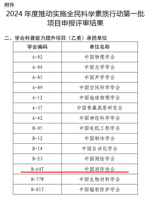 自《中國科協科普部關于組織實施2024年度推動實施全民科學素質行動第一批項目申報評審的通知》(科協普函綜字〔2024〕13號)發布以來,我會積極響應,精心籌備,項目由中國消防協會科普教育工作委員會副主任兼秘書長紀杰教授主持。經中國科協資格審查、專家評審,此次有15家申報單位承擔甲類項目,我會與其他49家學會承擔乙類項目。我會將充分發揮自身專業優勢,切實做好項目落實工作,確保項目取得實效。