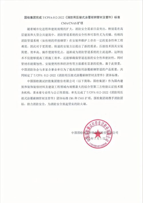 近期,中國國檢測試控股集團(tuán)股份有限公司秉承著專業(yè)性與公正性原則,采信我會(huì)團(tuán)體標(biāo)準(zhǔn)T/CFPA012-2022《消防用壓接式涂覆碳鋼管材及管件》完成CMA/CNAS擴(kuò)項(xiàng)。我會(huì)消防團(tuán)體標(biāo)準(zhǔn)在檢驗(yàn)檢測、認(rèn)證認(rèn)可應(yīng)用領(lǐng)域邁出了堅(jiān)實(shí)的腳步。下一步,我會(huì)將抓緊抓牢團(tuán)體標(biāo)準(zhǔn)制修訂工作,進(jìn)一步提升團(tuán)體標(biāo)準(zhǔn)編制質(zhì)量,為促進(jìn)消防行業(yè)高質(zhì)量發(fā)展助力。