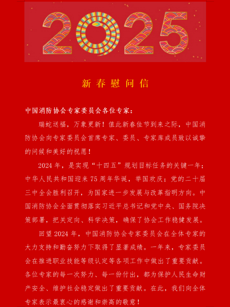 瑞蛇送福,萬象更新!值此新春佳節到來之際,中國消防協會向專家委員會首席專家、委員、專家庫成員致以誠摯的問候和美好的祝愿!