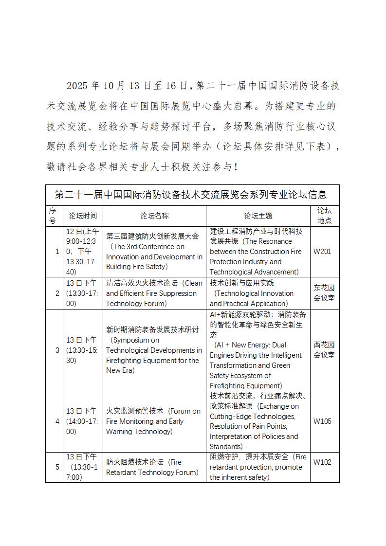 第二十一屆中國國際消防設備技術交流展覽會系列專業論壇預告