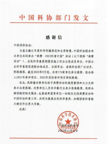 2023年1月13日上午,中國消防協會收到中國科協科普部的《感謝信》,由衷感謝在“典贊?2022科普中國”活動舉辦過程中,中國消防協會給予的高度重視和大力支持,并向工作人員的辛勤付出表示崇高敬意。